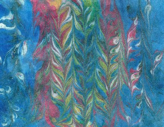 My Second Try at Marbling PaperBack to First Try page Several weeks passed as gardening season was in full swing. Finally, Memorial Day weekend came and I thought, I'll try that marbling again. Fortunately I had two pieces of paper I had already drenched in mordant from my first try, and I had ample sizing solution (methyl cellulose) available as well. The results being much more interesting, first I'll show them to you, then I'll tell you what I did differently that might help you with your marbling learning curve. If you have Internet Explorer 7 (or higher, when this becomes ancient history) you can use the magnifying function to see greater detail in the images. First of all, I used a lot more ink than in my first try. I made straight lines of ink across my cookie pan (on top of the sizing). They did not disperse very much so after trying put one inside another I just laid them down close to each other in parallel. Secondly, I did not try to paint with the stick I used to make the pattern; I just did a simple grid (in the second image, which I did first, the grid was parallel to the sides of the paper. In the image on the left I did a diagonal grid). The only thing I did fancy was to put some of the ink down in wavy lines instead of in parallel lines. Most important, when you lift up the paper it doesn't look like there is a pattern on it; it looks muddy. Go ahead and wash all the mud off under gently running water as quickly as you can. The actual pattern has gone into the paper on contact. Fourth, this process takes a lot of paint. My kit came with 6 colors, 1/2 ounce each. Even though I had used minimal ink on my first attempts, by the time I did the 3rd page I was running out of some colors. Which leads to my fifth observation. Depending on what you want to do, it may not be necessary to clean the pan between sheets of paper. It is true that your pattern gets destroyed when the paper is dipped. Paint remains, and tends to be blurry. But for my 4th page (left image above) I left the mostly blue ink and made lines and then sputters with all the remaining ink from my kit. It actually ended up being an interesting piece. But don't skimp on paint. In addition to the kit I used, there is also a kit available at Dharma Trading Company that includes dispersant. It comes with only three colors of paint, but you can choose the colors and you get 4 oz of each, so you could do a lot more paper, silk or cotton. [My wife buys blank silk and cotton from Dharma for projects] Back to My First Try at Marbling Paper |